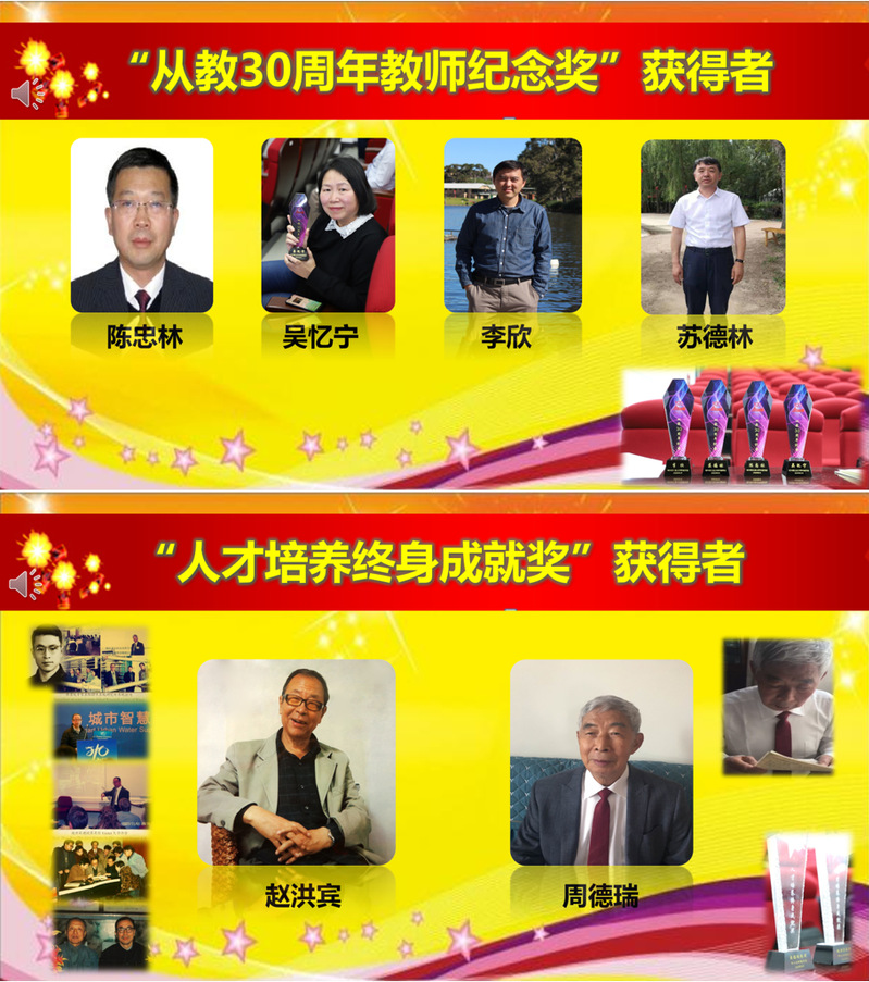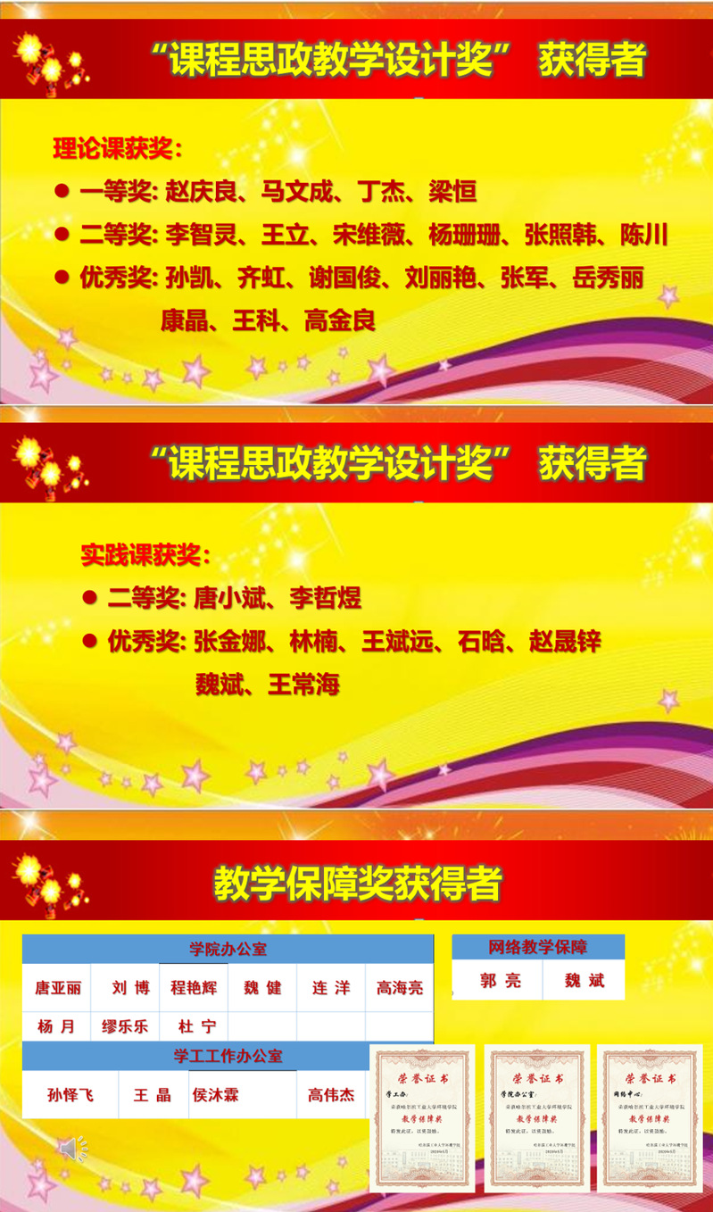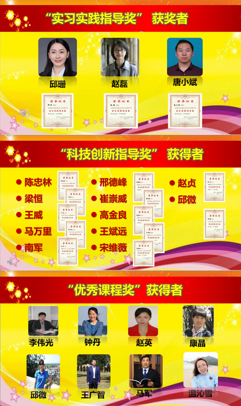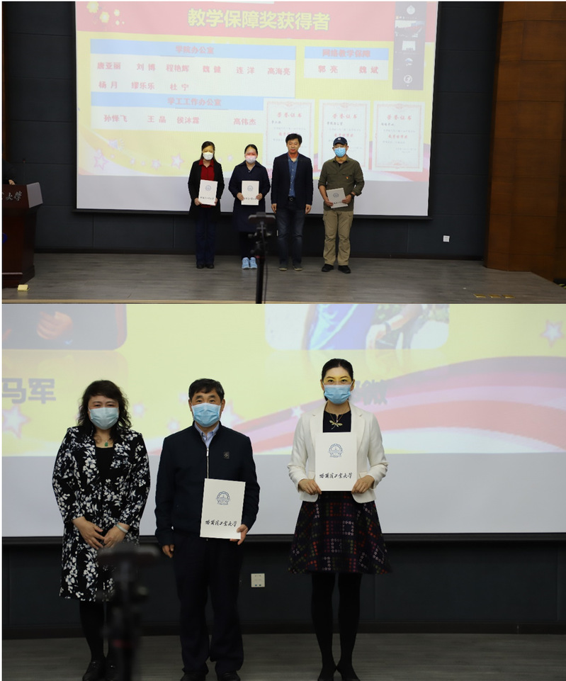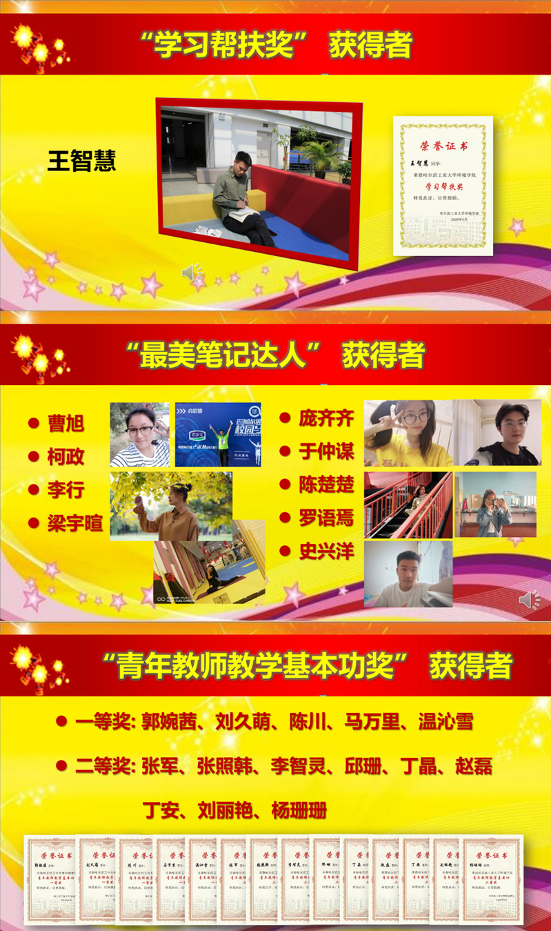 在此次闭幕式上颁发了“网红教师奖”、“实习实践指导奖”、“科技创新指导奖”、“优秀课程奖”、“课程思政教学设计奖”、“教学保障奖”、“金牌教师奖”、“师德标兵奖”、“学习之星奖”、“学习帮扶奖”、“最美笔记奖”、“青年教师教学基本功奖”、“从教30周年纪念奖”和“人才培养终身成就奖”等奖项。获奖学生代表王智慧同学线上发表了感言,金牌教师奖获得者马军、邱微,师德标兵奖获得者马放,青年教师教学基本功获奖教师代表刘久萌,从教30周年纪念奖获得者陈忠林、吴忆宁、李欣、苏德林,人才培养终身成就奖获得者赵洪滨教授现场发表感言、周德瑞教授进行线上寄语,获奖教师表达了自己的喜悦之情及对教育事业的热爱和不懈努力的决心。