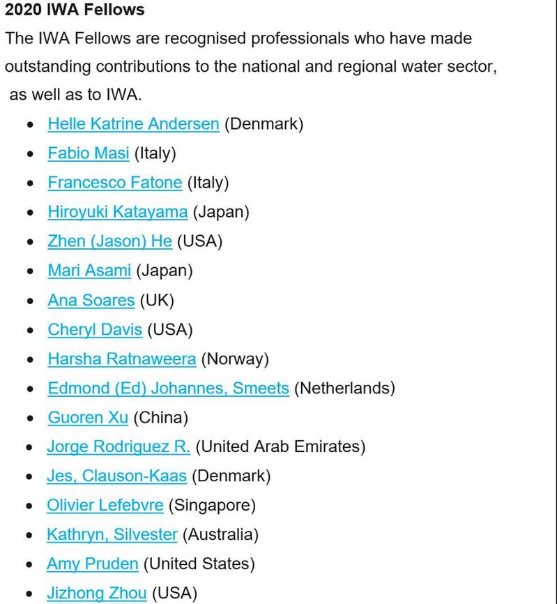 为了表彰在行业中取得突出成绩、做出长期贡献、具有国际影响力的IWA国际水协会员,IWA专门设立了IWA会士(IWA Fellow)和杰出会士(IWA Distinguished Fellow)的荣誉机制,每两年开展一次提名和评选工作。2020年度共有24位优秀行业专家和学者新晋入选,包括杰出会士7人,会士17人,其中包含四位华人学者,包括获得IWA会士荣誉的a片动画 许国仁教授。明年5月9日-14日在丹麦哥本哈根的IWA世界水大会期间,将举办IWA会士&杰出会士颁奖典礼。