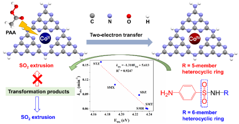 钴基类芬顿体系是一种前景很好的高级氧化技术,被广泛应用于处理难降解有机污染物。该过程的主要氧化机制一直被认为是通过单电子转移产生各类自由基来完成的。郭婉茜教授团队在通过钴活化过硫酸盐体系的氧化机制进行再次探索时,意外地发现了高价钴氧化物种(Co(IV))的存在,并在酸性条件下起主导作用,这一发现打破了对钴基类芬顿过程的传统认识。受此启发,郭婉茜教授团队将该机制进一步推广到钴活化过氧乙酸体系。研究结果表明,类似与钴活化过一硫酸盐过程,该机制在过氧乙酸体系中依旧存在。在酸性条件下,二价钴可以与过氧乙酸发生双电子转移反应(氧原子转移),产生Co(IV)。由于Co(IV)的强氧化性和选择性,钴基过氧乙酸体系可以高效地氧化具有富电子基团地有机污染物(如卡马西平、双酚A和各种磺胺类抗生素等),而且对环境中存在的无机干扰离子和腐殖酸表现出了一定的抗性。相关研究深化了对钴基类芬顿体系的认识,推动难降解废水处理理论的革新和发展。