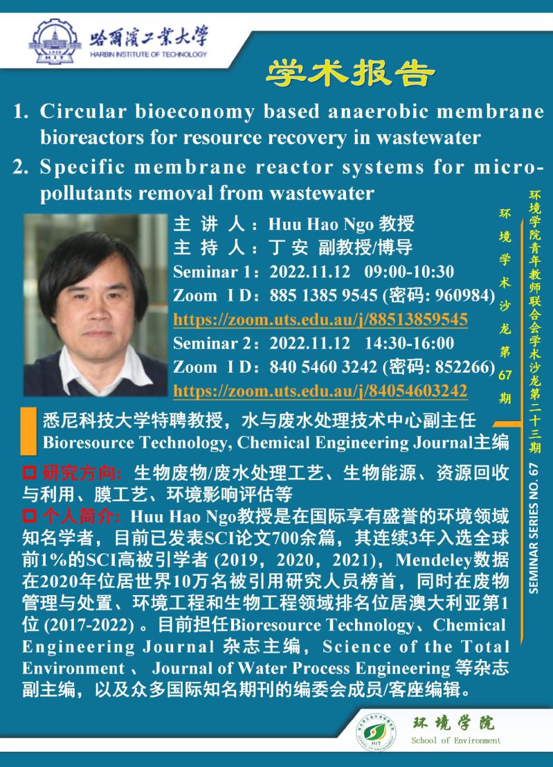 悉尼科技大学特聘教授,水与废水处理技术中心副主任,Bioresource Technology, Chemical Engineering Journal主编Huu Hao Ngo教授将于2022年11月12日与a片动画 师生进行学术交流,欢迎感兴趣的师生参加线上学术报告会。