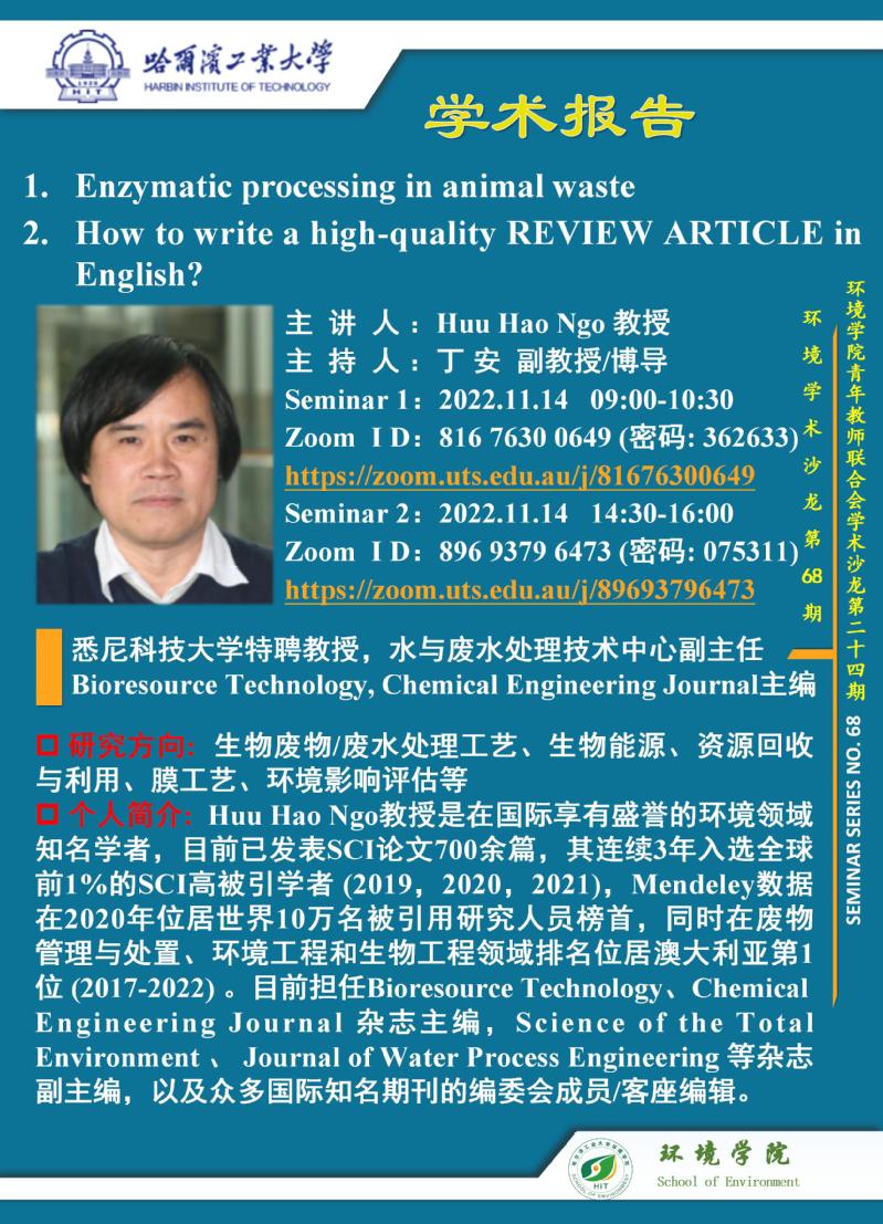 悉尼科技大学特聘教授,水与废水处理技术中心副主任,Bioresource Technology, Chemical Engineering Journal主编Huu Hao Ngo教授将于2022年11月14日与a片动画 师生进行学术交流,欢迎感兴趣的师生参加线上学术报告会。