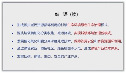 此外,马军院士还介绍了“有污染控制向环境综合整治与资源利用方向转变”、“由末端治理想源头污染控制与资源循环利用转变”、“由垃圾集中焚烧填埋向源头回收资源循环转变”、“由集中式大型城市供水管网向集散管网方向转变”、“由统一排水管网末端治理向源分离资源利用方向转变”、“村镇由末端治理向源头粪便分离制肥与水回用转变”共九个应对未来生态风险的城市发展对策。