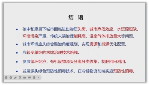 最后,马军院士总结道,在碳中和愿景下,城市环境面临更加复杂多变的生态问题,而想要从根源上解决这些问题,应当注意进行城市环境治理的综合规划,转变以往单纯的末端治理模式,发展循环经济,形成源头减污、资源循环利用模式。