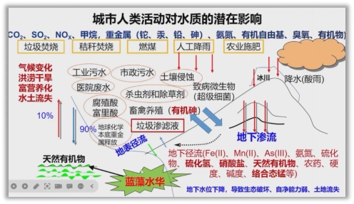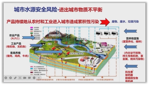 马军院士指出,随着城市规模不断扩大形成城市群,各类城市生态环境失衡的核心问题逐渐突出,首先是进出城市物质不平衡造成的城内物质堆积,无法被环境纳收,城外物质不断流失,物质匮乏,逐渐退化;其次,城市发展导致人类活动更容易对水源水质造成影响,垃圾焚烧、污水排放、新式材料带来的难降解物质污染与垃圾渗滤液污染等问题,城市发展压缩了原有环境的自恢复能力,各类污染通过水循环、大气循环不断进入水体,导致水质环境条件愈发复杂,处理难度与要求愈发提高。