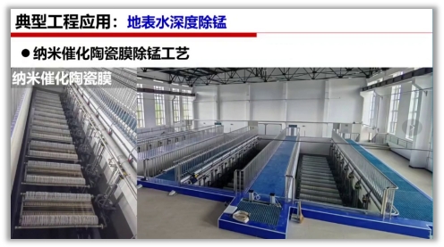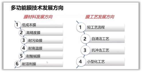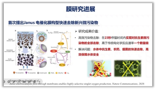 膜工艺的安全性强、占地面积小、耐冲击性强,将膜技术和高级氧化技术有机组合实现源头的减污回用。马军教授介绍了多功能膜技术的发展方向,例如:低成本膜、耐污染膜、耐高温膜、高精度膜等。马军教授也介绍了该团队的膜研究进展,通过制备低压无机膜用于乳化油废水处理,构建了UF-MD-FO组合工艺,实现同时对含油废水和生活污水的低能耗处理。提出Janus电催化膜构型快速去除新兴微污染物。通过构建催化氧化功能无机膜,提高膜滤性能,强化催化氧化过程,减轻膜吸附污染。采用氟岛结构的抗污染膜进行油水分离。催化耦合陶瓷膜对地表水深度除藻除锰。