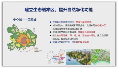 首先是由超大型城市转型为中心城+卫星城的组合,并在城市规划中加入生态缓冲区的布局,建立生态缓冲区、河、湖、库、湿地的统一规划。卫星城的建设模式加上城市内的生态区可以有效地削弱当前超大型城市面临的高强度热岛效应,提高城市的生态自净化功能,强化城市韧性功能。