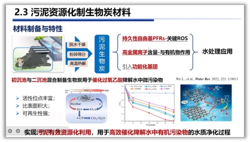 马军教授还介绍了一些有机废物资源化利用的技术,将厨余垃圾采用低成本的催化方法制备成油,应用于航空领域。将污泥资源化利用制备成生物炭材料,用于高效催化降解水中有机污染物。将废弃禽畜蛋白质有效资源化利用,高效吸附去除水中污染物。将贻贝类的生物质制备成仿生炭材料,通过吸附、催化、膜过滤等作用实现水质的净化强化。