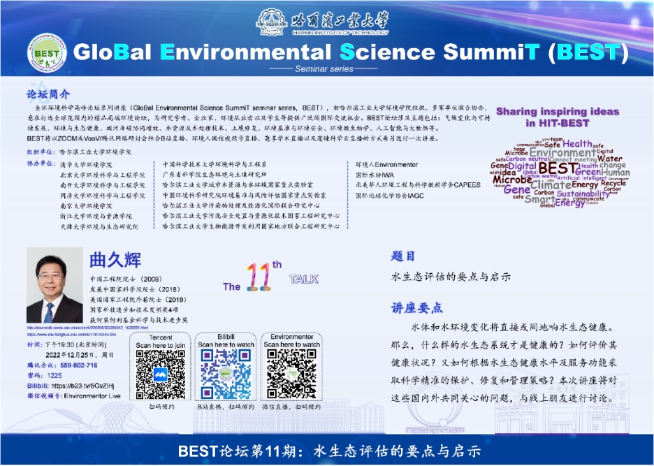 应BEST的邀请,BEST第十一讲将由中国工程院院士曲久辉教授进行。