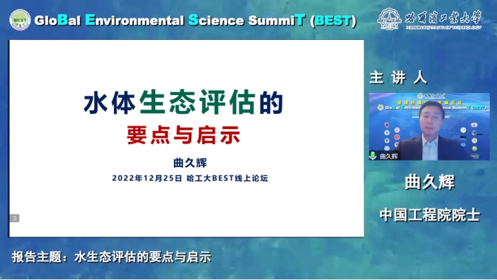 2022年12月25日晚,由a片动画 组织、多家单位联合协办的全球环境科学高峰论坛(GloBal Environment Science SummiT, BEST)系列讲座第十一期顺利举行。本期邀请了曲久辉院士进行了以“水体生态评估的要点与启示”为题的精彩报告。报告在腾讯会议网络研讨会、环境人微信视频号、BEST论坛官方B站、蔻享学术、邃瞳科学云、中国给水排水以及环境工程学报微信视频号等网络平台同步直播,共计两万余名来自环境领域的专家、学者、研究生及工程技术人员参与了本次讲座。