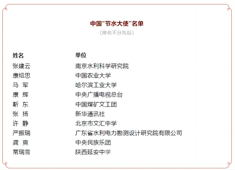 据了解,中国“节水大使”选聘工作由水利部、全国人大环境与资源保护委员会、全国政协人口资源环境委员会、教育部联合开展,旨在深入推进国家节水行动,加强节水宣传教育,提升全民节水意识。经过调查评估、征询本人和所在单位意见、会议综合评议、社会公示等环节,共遴选出10名来自不同领域、具有较高知名度影响力且热心公益事业、社会形象良好的中国“节水大使”。