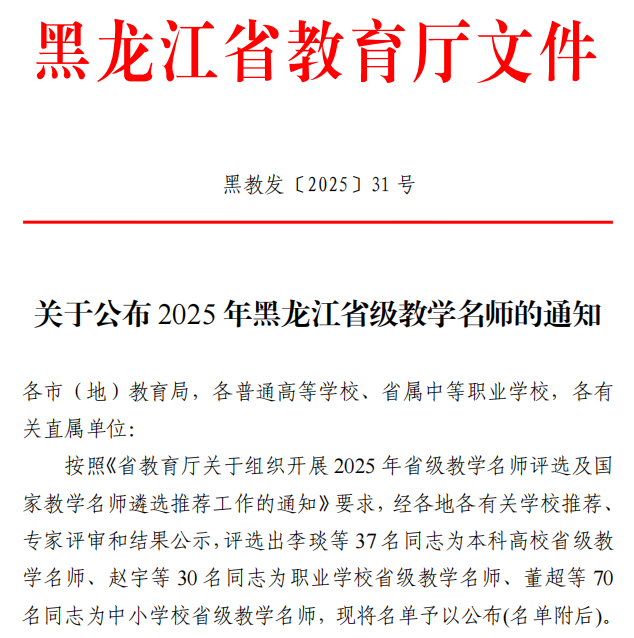 近日,黑龙江省教育厅正式公布了2025年黑龙江省教学名师评选结果,a片动画 邱微教授光荣入选。