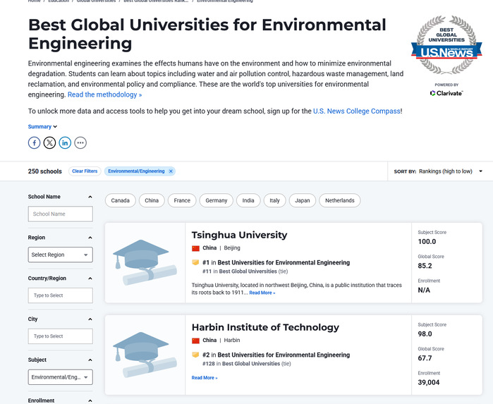 环境工程学科2025-2026年度U.S.News世界大学学科排名