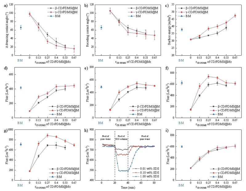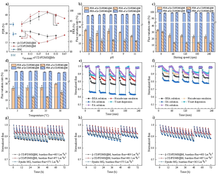 研究成果揭示了CD类型、CD/PDMS摩尔比-CD/PDMS聚轮烷动态性-膜综合性能间的级联关系,确定了最佳抗污染层结构。因γ-CD空腔大、柔性强,γ-CD/PDMS聚轮烷的动态性优于β-CD/PDMS聚轮烷。当CD和PDMS链节数量比为0.27~0.40时(CD完全覆盖PDMS时该值为0.67),CD/PDMS聚轮烷动态性最强,此时单个CD动态性和CD数量的乘积最大。实验结果表明,膜综合性能在超分子抗污染层动态性最强时达到最高值,20℃下渗透通量500 LMH·bar-1,过滤BSA溶液通量衰减率14.2%,恢复率99.7%,且优秀抗污染效果普适于酵母菌、腐植酸、海藻酸钠、乳化油等多种污染物,在松花江水、市政污水和鲁奇炉煤气化污水等实际水体的72小时错流实验中,也表现出了优越的稳定性,每个反洗周期(4小时)中衰减率仅为3%-7%,化学清洗后通量恢复率接近100%。反证实验表明了超分子动态性是膜通量提升的关键因素,基于AFM的作用力测定和微量吸附实验进一步证明了超分子动态性在膜抗污染能力强化方面的多重作用。团队通过实验和理论的相互验证,为水处理膜抗污染能力强化提供了更多策略。