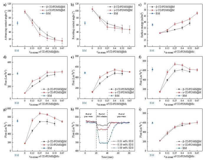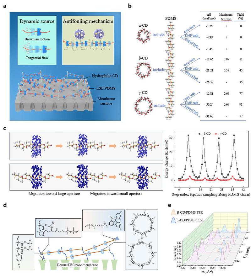 针对上述问题,团队提出使用超分子而非高分子在水处理膜表面构建抗污染层的策略。超分子为由聚二甲基硅氧烷(PDMS)和环糊精(CD)组成的聚轮烷。PDMS为低表面能线性大分子,CD是亲水环状小分子,CD-PDMS聚轮烷呈线穿环结构。CD可沿PDMS链滑动、旋转和振动,形成相对动态亲水-低表面能非均相微区。这一结构可使污染物与膜表面的接触不稳定,辅以CD的布朗运动,能够在低切向流,甚至静态条件下有效驱除膜表面污染物。此外,还可防止低表面能组分团聚,并通过氢键作用携带并促进水分子传输。