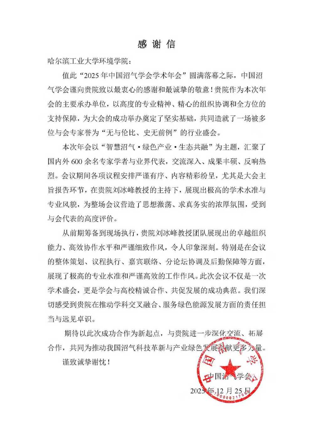 会议结束之际,a片动画 作为承办单位,收到了中国沼气学会的感谢信。未来,学院将继续支持相关学科发展与产学研合作,积极为国家绿色能源事业贡献力量。